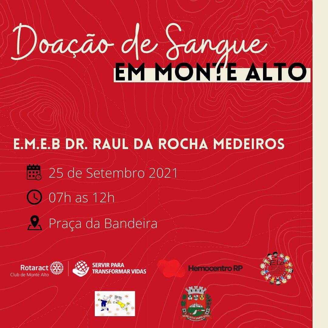 No dia 25 de setembro, o Rotaract Club de Monte Alto organizou em parceria com o Hemocentro de Ribeirão Preto, grupo ELO e Prefeitura Municipal a doação de sangue na cidade de Monte Alto. O projeto “Doe Vida! ”, surgiu em virtude do baixo número de bolsas de sangue armazenadas no estoque do Hemocentro, e ocorreu ao longo de todo mês de setembro com a divulgação das informações necessárias para aqueles que quisessem ser doadores, nas rádios, TV online e mídias sócias, bem como relatos de pessoas que necessitaram de transfusão de sangue e sabem da importância desse gesto tão lindo que é a doação. Ao final, foram coletadas 130 bolsas de sangue que farão a diferença para inúmeras pessoas. Durante todo o projeto, inúmeros elogios foram feitos pela comunidade, ao clube e principalmente aos associados, pois sem o empenho e dedicação dos mesmos o projeto não teria acontecido!