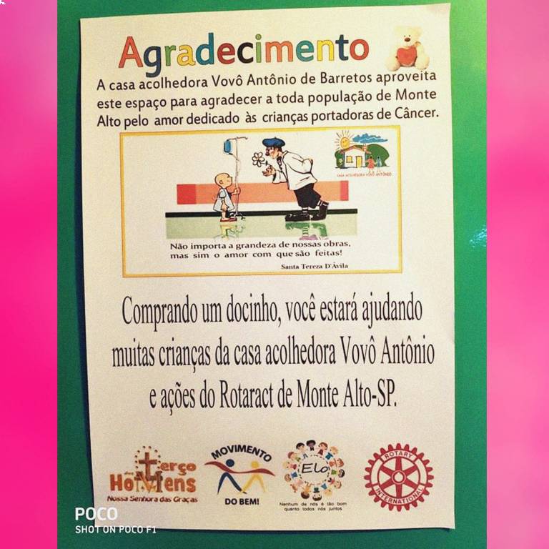 Em parceria com o terço dos homens, o Rotaract Club de Monte Alto realizou o projeto “Doce Parceiro”. O projeto aconteceu do dia 06/12/2019 até o dia 23/12/2019, foram realizadas vendas de doces caseiros em um trailer em frente à praça central de Monte Alto. O lucro das vendas foi de R$4060,00 sendo voltado 50% desse valor ao caixa de projetos do clube, e 50% voltado a casa acolhedora do vovô Antônio (Hospital do Câncer de Barretos).